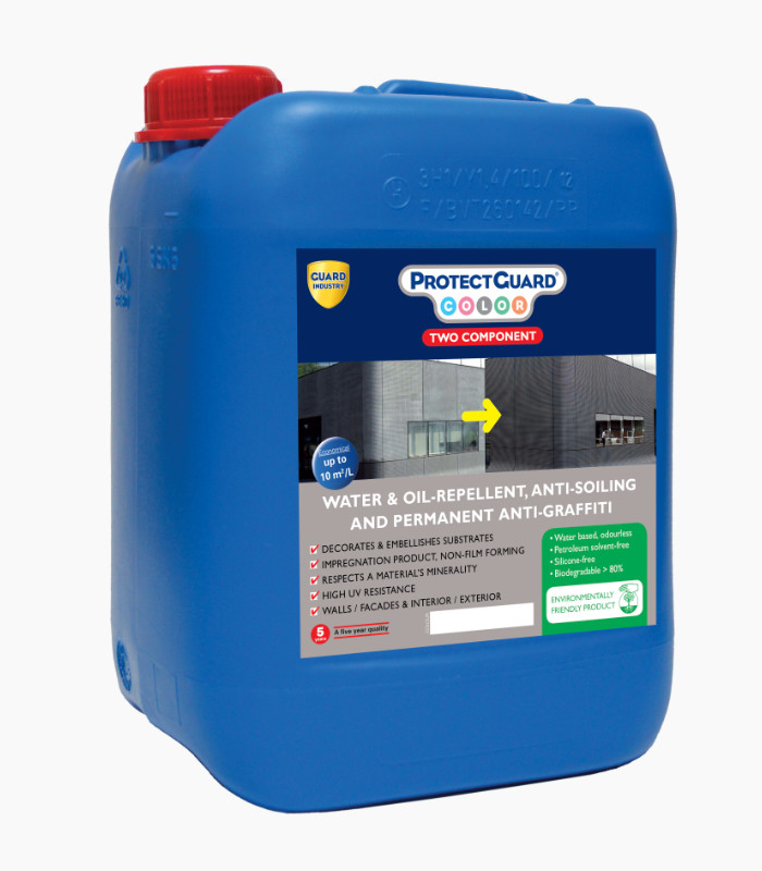 - Transparente Abdichtung. ProtectGuard®Color Two-Component ist eine transparente Imprägnierung, die sich für den Schutz aller porösen Materialien (Beton, Sandstein, Ziegel, usw.) eignet. Im Gegensatz zu Farbe ist es ein durchscheinendes Produkt, das die mineralischen Eigenschaften der Materialien nicht verändert. Die endgültige Farbe hängt von der Farbe des Imprägniermittels und der Farbe des Untergrunds ab. ProtectGuard®Color Zweikomponenten bildet keine Beschichtung und behält die Durchlässigkeit der Oberfläche für Wasser und Wasserdampf bei.