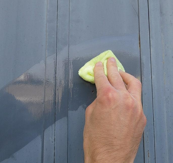 - Spülen Sie gründlich nach, bis die Oberfläche frei von allen Spuren des Reinigers ist. Warten Sie mit dem Auftragen, bis die Oberfläche vollständig trocken ist.